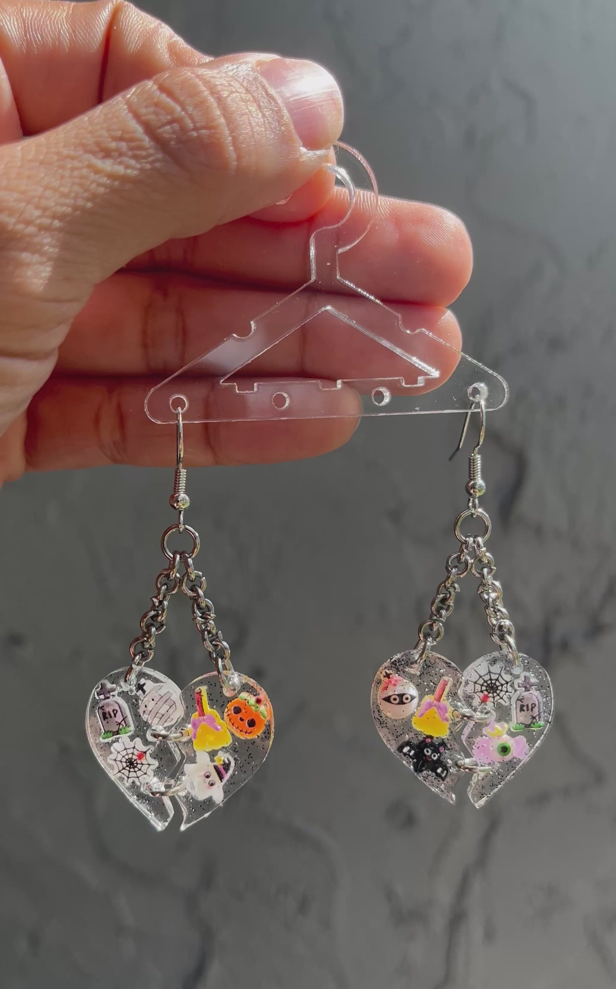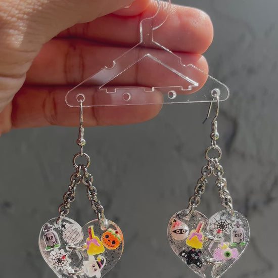 These Halloween-themed dangle earrings feature a spooktacular design, perfect for those who love Halloween. They are adorned with assorted charms, black glitter, and clear resin to add a touch of fright to your outfit.